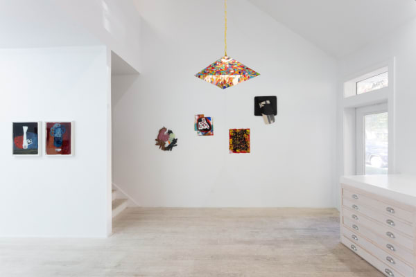 Beverly Semmes uses stereotypes of femininity and gender representation as a subject across many mediums. Originally shown as part of a larger presentation at the 57th Carnegie International, Grey Veil, Melons, and Red White and Blue (all 2017), use oil paint and pornography magazines on glass to conflate women’s bodies and vessels. The glass as substrate allows the viscous qualities of the oil paint to activate and personify the evocative containers.